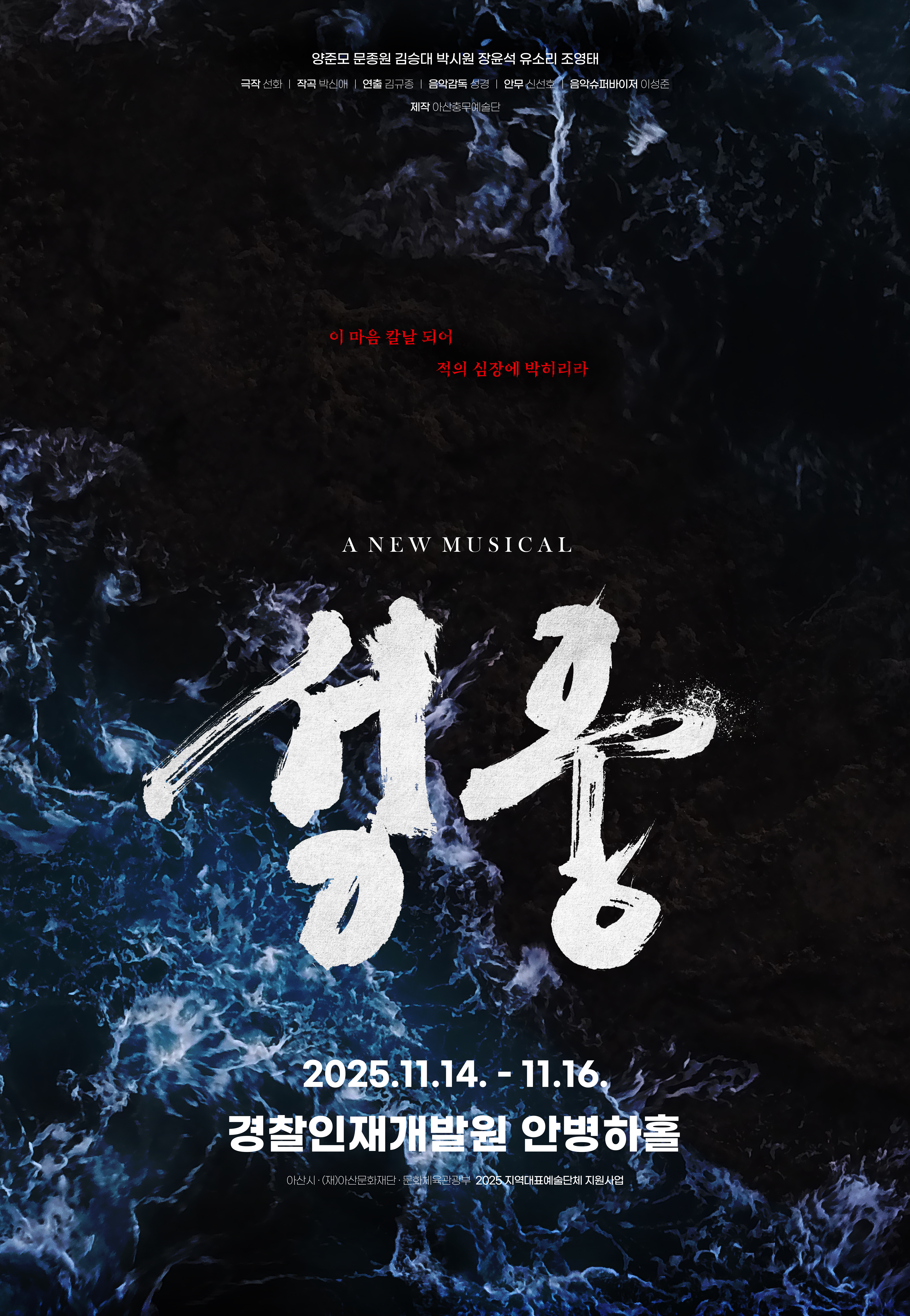 1597년, 가장 큰 시련 속에 선 이순신 장군. 뮤지컬 <성웅>은 이미 잘 알려진 ‘위인의 업적’보다 한 인간이 감당해야 했던 고뇌와 용기, 그리고 흔들림 없는 신념을 무대 위에 그려냅니다. 화려한 전투 장면보다 더 강렬한 것은, 절망의 순간에도 굽히지 않았던 이순신의 내면입니다.
