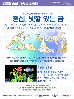 이중섭의 그림 속 세상이 무대 위에 살아난다. 〈중섭, 빛깔 있는 꿈〉은 ‘소와 어린이의 화가’ 이중섭의 삶과 사랑을 담은 비언어 오브제극이다. 파도소리 가득한 무대에서 그의 그림 속 부부와 아이가 오브제로 되살아나 행복과 이별을 그린다. 대사 없이 마임과 오브제로 펼쳐지는 장면은 어린이에게는 감성적인 예술 경험을, 어른에게는 깊은 울림을 선사한다.