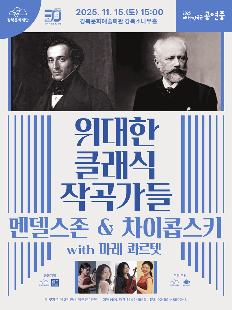 Jointly presented by the Gangbuk Cultural Foundation and NCM Klassik, this stage features the Mare Quartet in masterful, deeply nuanced interpretations of Mendelssohn and Tchaikovsky’s landmark string quartets. The program includes Mendelssohn’s String Quartet No. 6 in F minor, Op. 80 in Part I and Tchaikovsky’s String Quartet No. 1 in D major, Op. 11 in Part II. The composers’ brilliance and musical depth are conveyed with sophistication through the quartet’s rich sonority and finely balanced ensemble.